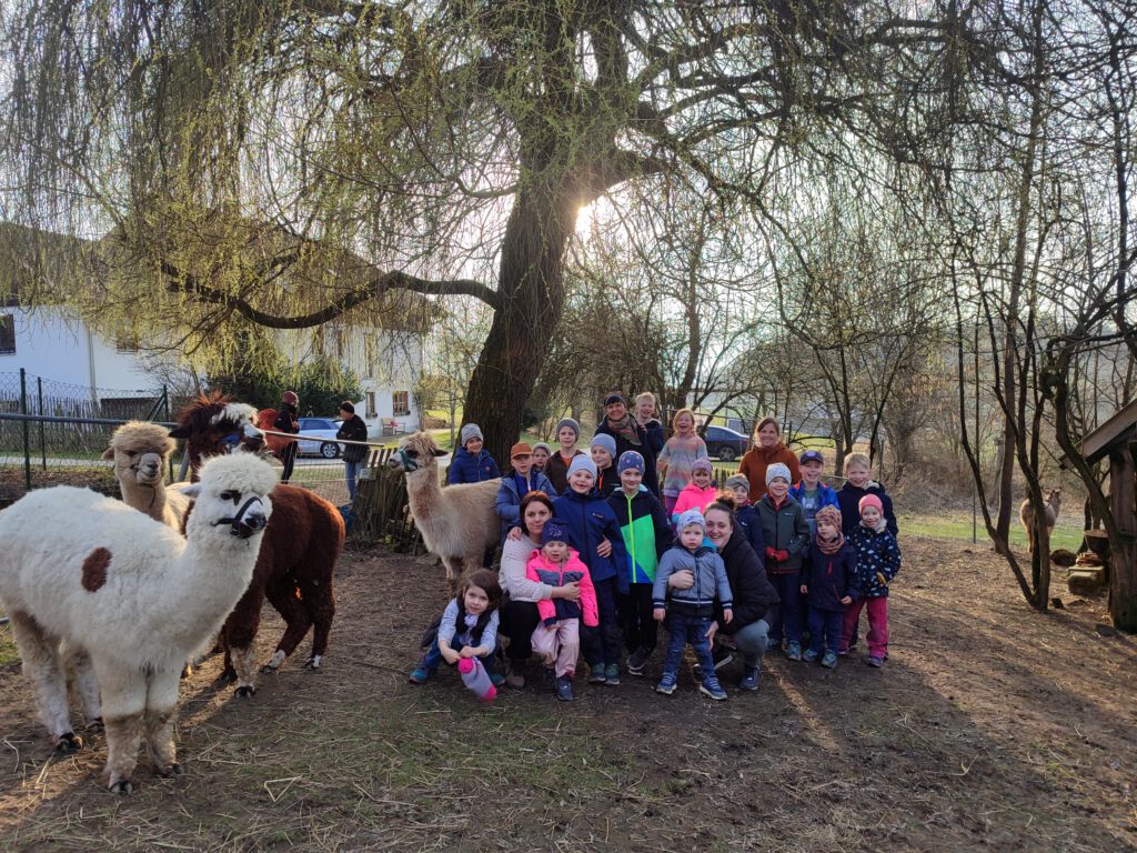 Pünktlich zum Frühlingsanfang trafen sich die Waldmeister und Wildbienenbande in Haibach bei Doris Wiesmüller zur Alpakawanderung. Die OGV Kinder samt Geschwister und Eltern wanderten etwa 1,5 Stunden mit Alpakas samt Esel Sophie durch die wunderschöne niederbayerische Landschaft. Zurück am Hof wurden die Hühner, Alpakas und Sophie gestreichelt, das Tippi erkundet und die Kletterbäume erklommen. Anschließend ließ es die Gruppe auf dem Hof der Familie Wiesmüller mit einer mitgebrachten Brotzeit ausklingen. Es war ein rundum gelungener Ausflug in neuer Konstellation. Die Treffen finden ab 2026 (wenn möglich) jeden letzten Freitag im Monat gemeinsam mit den Waldmeistern und der Wildbienenbande statt.